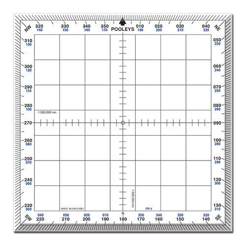 Standard flying school issue. 128mm square. 0-360 scale on outside edge with reciprocal headings indicated adjacent. Location letters NE, SE, SW, and NW on corners. Centre drilled for location and gridded in squares of 13mm (4 nm). Supplied in self-sealing clear plastic case.