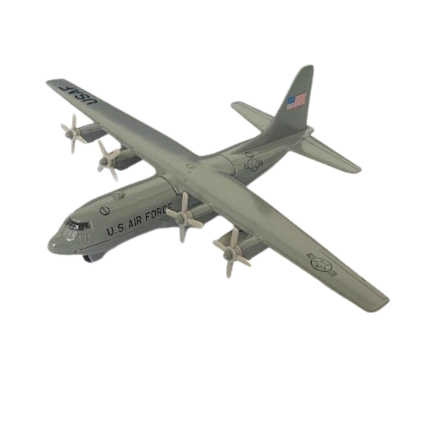 Diecast C130 Hercules by Motormax with stand and a collectable card.